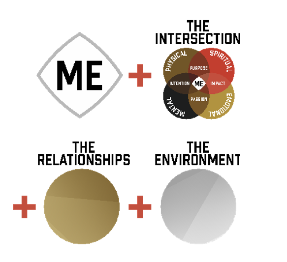 Me (as in each individual) + The Intersection (Training to flourish in the four dimensions of well-being) + Relationships (The relational connectivity within the group) + The Environment (Standards & Behaviors).