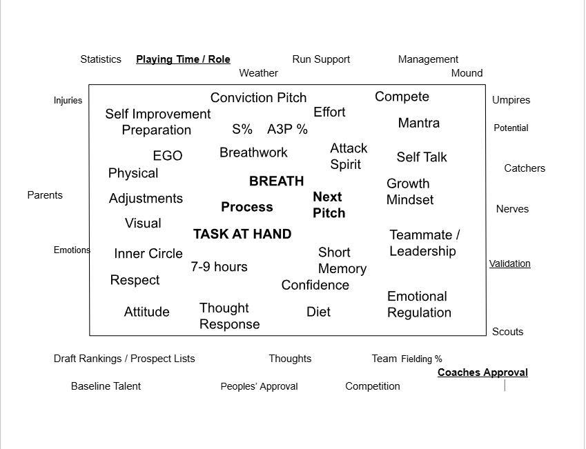 One of my favorite exercises I do with clients is The Control Box. Take out a sheet of paper and create a rectangle in the middle. Begin to think of all of the components of your life in high performance. If it is something you can control - write it in the inner rectangle. If it is something out of your control (the weather, umpires, teammates, parents, fans, etc.)