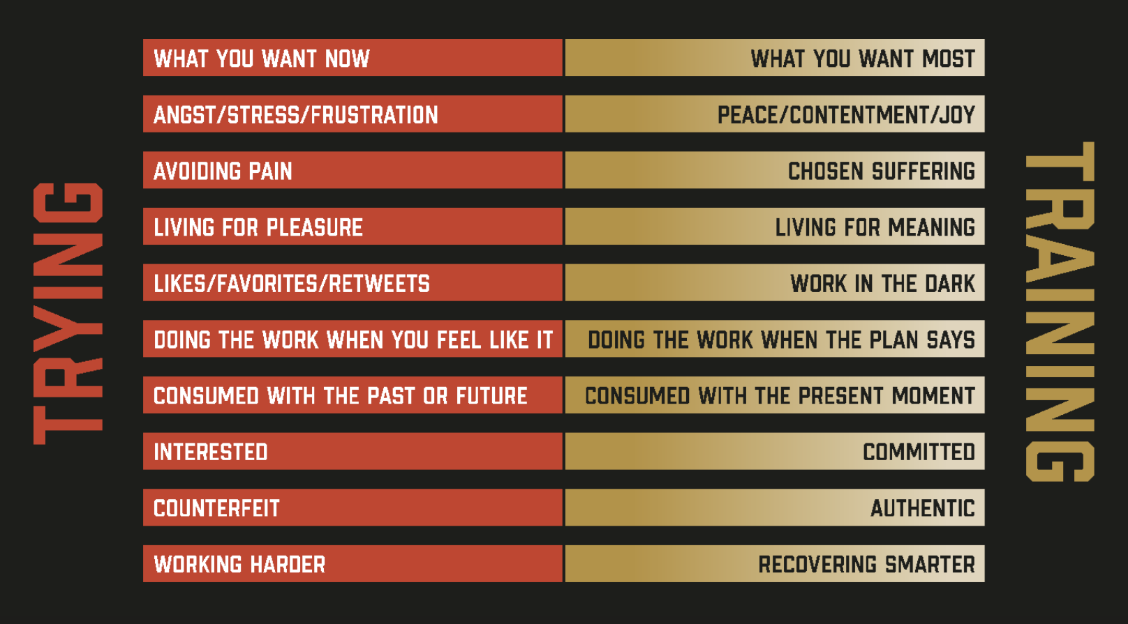 One of my favorite discussions with high performing athletes, coaches and leaders often comes around discovering the difference between a training mindset and a trying mindset in this image below.